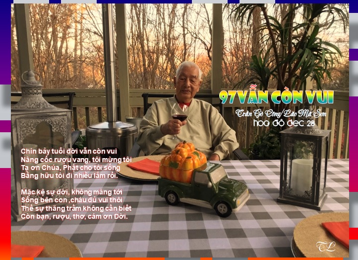 Nhân sinh cung mệnh bởi Trời, Năm nay chín chín (99) tuổi rồi (*) Trái tim chan chứa tình thương, Trọn đời, còn lại túi thơ, Hữu bằng tình nghĩa uyên thâm, Richmond, Virginia Chỉnh sửa lại bởi Lan Huynh - 23/Feb/2021 lúc 8:35am |