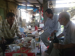 Hình cuối cùng là bàn nhậu bình dân tại nhà cụ khi tiệc đã vào lúc cao trào. Chai rượu mà cụ Thinh cầm trên tay ở tấm hình này, đố các bạn nào tìm ra ở Việt Nam có nó thì tớ đi đầu xuống đất. Rất vui, rất hạnh phúc và rất sảng khoái từ tâm hồn đến thể xác trong ngày thầy thuốc Việt Nam năm nay. Dù hôm qua thu nhập ở clinic của tôi bị giảm nặng, không đủ để trả lương cho đồng nghiệp và tiền thuê nhà, điện, nước trong ngày. Nhưng thôi, đời phải có lúc này, lúc khác thì thế mới gọi là đời. Trong loạt hình này tôi không có mặt. Vì hình có mặt tôi thì Tư Cương giữ trong máy của anh ấy. Chờ Tư Cương làm ra sản phẩm và mail cho tôi, tôi sẽ update để mọi người diện kiến và ra đường không bị đánh nhầm nhen.