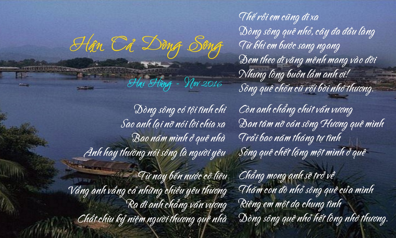 Em có biết thân anh gần hóa đá ![]() Con gấu ngủ chờ Xuân về thức dậy ![]() Như con chim mải mê tìm vũng nước ![]() Ở nơi nào em có biết hay không? ![]() Anh ngồi đây nhìn tuyết rớt bên song ![]() Róc rách đôi bờ, một mái chèo đưa ![]() Sông còn kia nhưng nước chẳng quay về Nếu một mai anh về râu tóc trắng Nguyên Nhung Chỉnh sửa lại bởi Lan Huynh - 05/Dec/2016 lúc 10:12am |