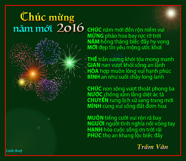 ![]() Mười hai tiếng gõ của chiếc đồng hồ lúc nửa đêm sẽ mang đến cho bạn các lời cầu chúc của tôi cho mười hai tháng sắp tới. Tiếng gõ đầu tiên Chúc Sức Khỏe chúc bạn có sức khỏe mà tất cả tiền bạc trên thế giới không thể mua nổi. Tiếng gõ thứ hai Chúc Tình Yêu chúc cho cuộc sống chung quanh bạn chan hòa tình yêu, chứ không đầy hận thù và chiến tranh. Tiếng gõ thứ ba Chúc May Mắn chúc bạn không bao giờ thiếu bất cứ điều gì trong cuộc đời. Tiếng gõ thứ tư Chúc có nhiều Giấc Mơ chúc bạn có nhiều giấc mơ và thấy chúng nên hiện thực. Tiếng gõ thứ năm Chúc Can Đảm chúc bạn can đảm chấp nhận những gì sẽ xảy đến. Tiếng gõ thứ sáu Chúc có nhiều Cuộc Gặp Gỡ chúc bạn cảm nếm được sự ngọt ngào của tình bạn và không bao giờ cảm thấy cô đơn. Tiếng gõ thứ bảy Chúc Gia Đình Hợp Nhất chúc bạn được vui hưởng những dây liên kết bền vững của một gia đình thân thương Tiếng gõ thứ tám Chúc Thành Công chúc tất cả các kế hoạch của bạn mang lại kết quả. Tiếng gõ thứ chín Chúc Bình An chúc cho trái tim bạn thoát mọi âu lo, hận thù và ghen ghét. Tiếng gõ thứ mười Chúc có Lòng Tri Ân chúc bạn luôn vui vì còn được sống mỗi ngày và mọi ngày. Tiếng gõ thứ mười một Chúc có Lòng tin tưởng. chúc bạn có thể nhìn vượt sang cả bên kia những điều kỳ diệu của công trình sáng tạo. Tiếng gõ thứ mười hai Lời Chúc Quan Trọng Nhất Chúc bạn nhận được phúc lành từng ngày và mọi ngày trong Năm Mới này. ![]() Chúc Mừng Năm Mới!