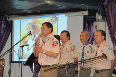 của Hội Ðồng Trung Ương Hướng Ðạo Việt Nam Hải Ngoại, nói về Trưởng Nguyễn Ðức Quang. (Hình: Ðỗ Dzũng/Người Việt) Sau nghi thức Hướng Ðạo, ông Võ Thành Nhân trao huân chương cho anh Nguyễn Ðức Tường, con trai của cố nhạc sĩ, trước sự chứng kiến của hàng trăm đồng hương ngồi kín nhà hàng. “Tôi thật sự xúc động khi nhận huân chương thay cho cha mình. Tôi cũng muốn cảm ơn phong trào Hướng Ðạo vì nghĩa cử danh dự này. Cuộc đời cha tôi thật đặc biệt mà khi ông còn sống tôi không biết hết. Ước gì tôi có thể làm được một phần những gì cha tôi đã làm,” anh Nguyễn Ðức Tường chia sẻ với Nhật báo Người Việt. Bắc Ðẩu Huân Chương là huy chương cao quý nhất của phong trào Hướng Ðạo Việt Nam trao tặng cho một trưởng có công gìn giữ và xây dựng một phương pháp giáo dục thanh thiếu niên. Theo Hội Ðồng Trung Ương Hướng Ðạo Việt Nam Hải Ngoại, cố nhạc sĩ Nguyễn Ðức Quang gia nhập Hướng Ðạo năm 1956, sau này trở thành trưởng và là linh hồn của Liên Ðoàn Lê Lợi. Cuộc đời hoạt động Hướng Ðạo và tham gia phong trào du ca của cố nhạc sĩ được rất nhiều người Việt Nam biết đến, không những trong thời gian chiến tranh mà ngay cả sau này ở hải ngoại. Nhạc sĩ tham gia thành lập Phong Trào Du Ca Việt Nam ở Sài Gòn năm 1966 và sáng tác nhiều ca khúc nổi tiếng như “Việt Nam quê hương ngạo nghễ,” “Bên kia sông,” “Vì tôi là linh mục,” “Chiều qua Tuy Hòa,” “Về với mẹ cha,” “Hy vọng đã vươn lên,” “Xin chọn nơi này làm quê hương”... Sự ra đi của cố nhạc sĩ Nguyễn Ðức Quang để lại nhiều nuối tiếc cho cả phong trào du ca hải ngoại, phong trào Hướng Ðạo và đồng hương. Nhạc sĩ Việt Dzũng, đại diện phong trào Hưng Ca, chia sẻ: “Tôi đau lắm, khi biết anh Quang ra đi. Chúng tôi rất thân thiết, từ ngày còn làm báo với cố nhà báo Ðỗ Ngọc Yến. Những người thiết tha ngày xưa giờ không còn nữa.” “Phải nói con đường anh Quang mở ra đã tạo nhiều hứng thú cho anh em ở hải ngoại sau này, ví dụ như nhóm Hưng Ca, nhóm Tù Ca. Rõ ràng, những tác phẩm anh Quang để lại là dấu mốc cho thế hệ sau trong mấy chục năm qua, vẫn thích hợp trong giai đoạn hiện nay và sau này nữa,” nhạc sĩ Việt Dzũng nói tiếp. Hợp ca “Việt Nam quê hương ngạo nghễ” để cùng hướng về