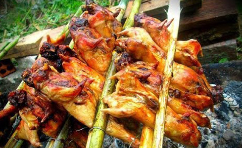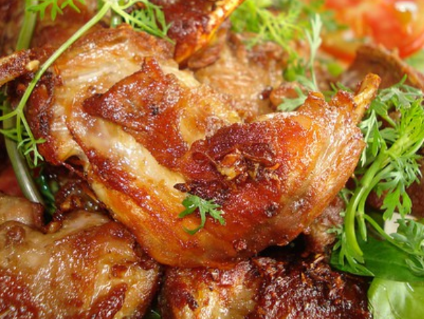 củi hoặc than rơm rực hồng, cho đến khi lớp da vàng giòn, có màu nâu óng mở của